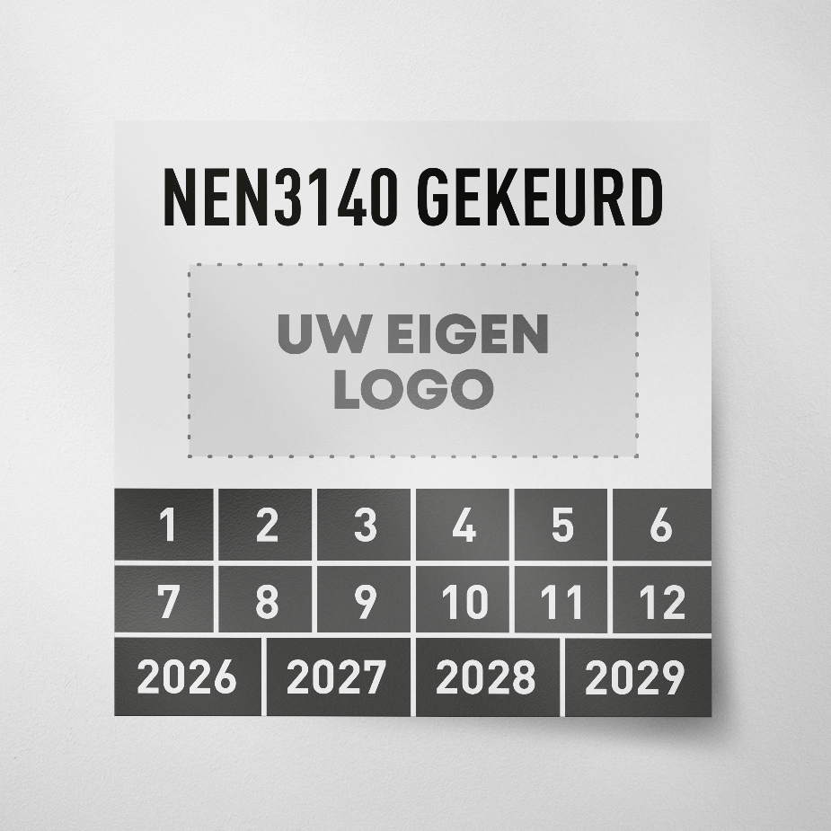 De vierkante NEN3140 stickers met logo bestel je eenvoudig vanaf 100 stuks. Je hebt de keuze uit 7 verschillende kleuren stickers en uit stickers met of zonder logo. Door de elektrische gereedschappen en machines in jouw bedrijf jaarlijks te keuren zorg je voor een veilige werkomgeving voor medewerkers en bezoekers en houd je je aan de wetgeving. Bij deze keuring moet de geldigheidsduur van de keuring aangegeven worden met een sticker waarbij de datum tot de keuring wordt ingeknipt met een kniptang of controletang. De keuringssticker kniptang kun je hier bestellen.